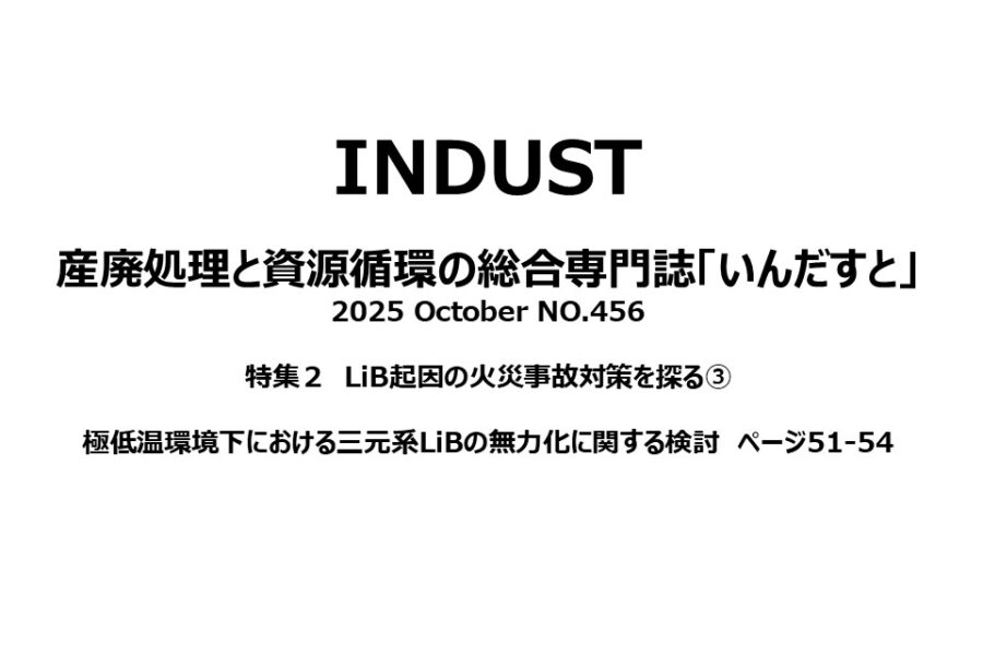 2025年10月号の特集2「LiB起因の火災事故対策を探る」の欄に、早稲田大学 小野田弘士研究室が、 「極低温環境下における三元系LiBの無効化に関する検討」と題し、寄稿しました。
